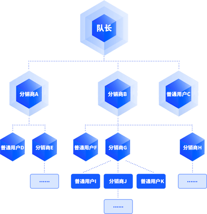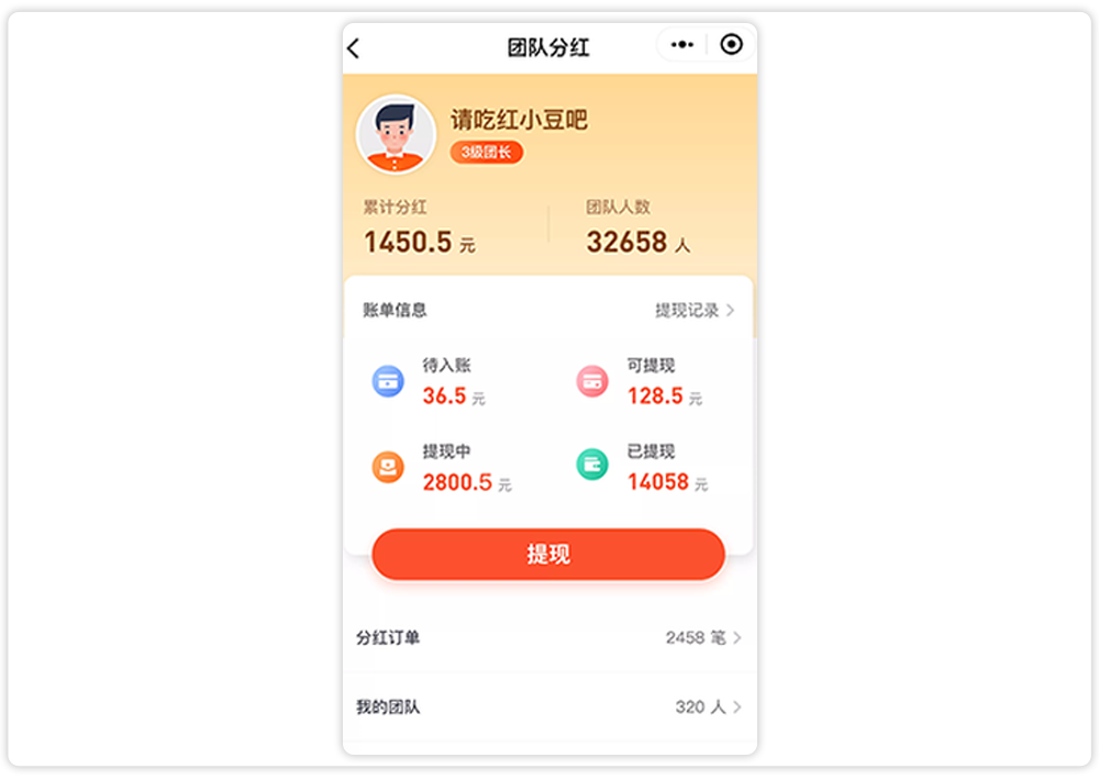 01 什么是团队分红 首先,团队分红是基于分销发生的。在分销商团队中,符合一定条件的分销商成为队长后,可享受在原有的佣金基础上,额外获得其整个团队销售金额一定比例的分红。 02 团队分红角色关系 队长 只有分销商才能成为队长 每个团队只有1个队长 队员 分销商和普通用户都可以成为队员 一个团队可以无限发展 队员成为队长后,将和其下队员独立成团 03 团队分红关系链展示 04 团队分红,让营销变得更简单 1、快速拉新拓客,实现裂变传播 利用社交关系链,推动用户快速转化,刺激产品与品牌曝光,助力商城快速销货; 2、下线无限发展,构建立体销售网络 一个团队下线可无限发展,队长只需专注团队经营和销售服务,轻松开启营销之旅; 3、分红佣金激励,打造粉丝经济 利用店铺和分红的吸引力,为平台积累粉丝;基于人与人的社交关系裂变,降低获客成本。 05 功能亮点 1、精细化团队管理 队长列表、待审核、队长信息等资料清晰展示,及时了解团队情况; 2、快速等级设置 等级分红比例、升级条件及升级限制灵活设置,打造有规则的团队分红战略; 3、便捷的订单处理 快捷查看订单详情、待审核订单、提现详情等信息,丰富的数据信息支持团队精细化运营; 4、多种队长申请门槛 您可自行设置队长申请门槛,达到门槛的用户可以申请为队长;若不设置申请门槛,则所有用户都可以申请为队长。 ○ 无(不推荐) ● 下线人数 ○ 下线分销商 ○ 累计分销佣金 ○ 已提现佣金总额 ○ 购买指定商品 06 页面展示 1、分销中心-团队分红入口 2、团队分红主页面 3、分红订单页面 4、我的团队页面