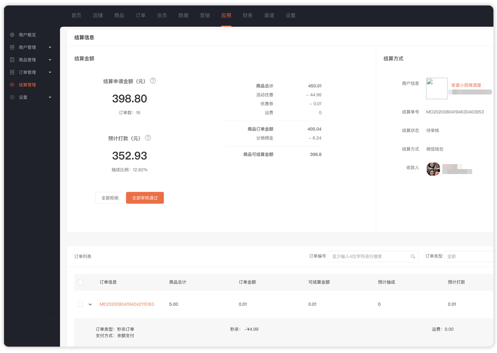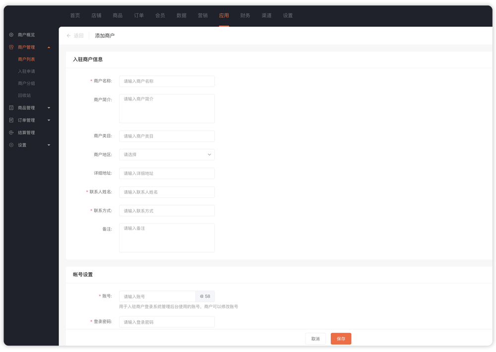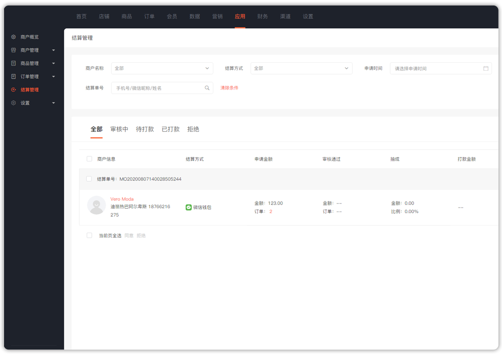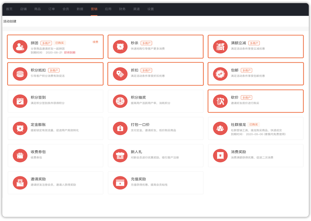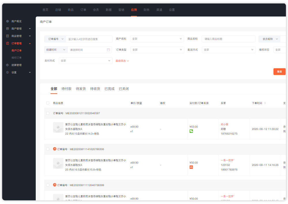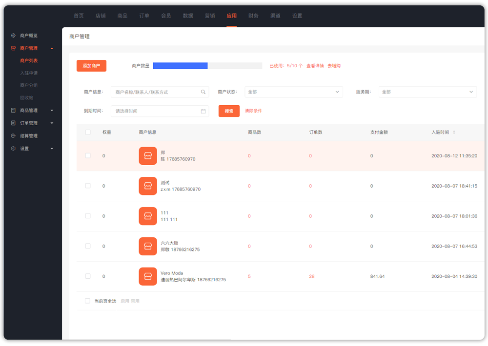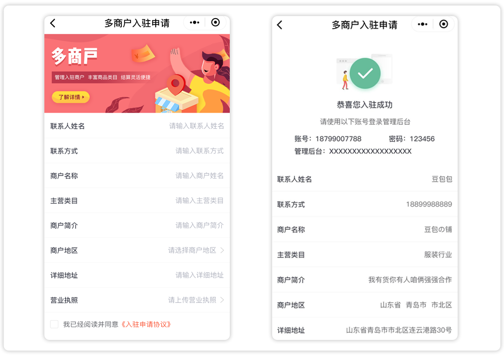客迈云多商户 原价:¥7699 启航版、精英版用户 在2020年8月18日-9月18日期间购买可享 上新价:¥5699 尊享版用户免费使用 在文末联系客户经理咨询详情 基本概述 多商户:“多商户”系统是一个面向大流量线上商城的全渠道信息化管理工具,提供完整的入驻子商户线上经营方案。 应用场景 张总从事男装行业,他想丰富商城的商品种类,一直在寻找其他商品货源。李女士是一家童装实体店老板,想开个小程序商城,线上出售自己的商品,但是没有在线经营的经验,担心没有充足的流量支撑。 于是李女士申请成为张总的子商户,利用张总的流量出售自己的商品。张总在自己的商城上架李女士的商品出售,也丰富了商城的商品种类,带来了更多不同群体的会员。 主商城-功能特色 1、完整的商户入驻经营方案 申请入驻:子商户在手机端发起入驻申请,由主商城审核。 ▲子商户入驻 ▲主商城-入驻设置 手动创建:主商城在后台手动添加子商户 系统化管理入驻商户:支持独立设置商户权限、营销活动及应用插件 ▲商户列表 ▲商户设置 商户商品管理:支持商品审核功能,子商户商品由主商城审核,通过后才可上架售卖 商户订单管理:子商户商品订单需要由商户进行发货 商户结算管理:系统化管理子商户结算申请 ▲结算管理 ▲待审核结算 2、多种结算方式 客迈云多商户的结算方式包括:主商城收款、微信分账、子商户收款三种,多种结算方式满足不同业务场景。 主商城收款: 买家购买子商户商品时,由主商城统一收款; 微信分账: 买家购买子商户商品时,根据指定比例自动进行分账;(即将上线) 子商户收款: 买家购买子商户商品时,由子商户直接收款。 3、支持多种营销活动 • 支持拼团、秒杀、积分抵扣、满额立减、折扣、砍价、包邮等多种营销活动; • 主商城营销活动可添加子商户商品; • 主商城优惠券可用范围支持设置“包含子商户商品”。 4、适配多种应用工具 分销:子商户商品支持参与分销 在线客服:子商户商品支持接入在线客服 消息通知:主商城可设置仅接收主商城相关消息通知(如催发货通知等) 店铺助手:主商城支持审核并管理子商户商品 积分商城:子商户商品支持添加到积分商城 快速购买:子商户商品支持添加到快速购买模板 直播带货:主商城可管理子商户创建的直播间 等等...... 5、设置商户列表 商户列表支持按“当前位置排序”和“按城市定位选择”两种排列方式。 6、店铺装修 • 装修页面新增“商户列表”组件 • 手机端-会员中心新增“关注商户”页面 子商户-功能特色 1、子商户后台独立运营 子商户后台独立管理运营,可在PC端系统后台和“店铺助手”小程序中管理商户商品和订单。 2、子商户店铺支持DIY装修 子商户支持店铺装修,可视化编辑,DIY自己的店铺首页和其他自定义页面,为商家快速提高人气。 3、支持多种营销活动 子商户支持创建多种营销活动和子商户优惠券,满足不同营销场景。 4、适配多种应用工具 子商户支持使用多种应用工具,助力店铺运营更加轻松便捷。 5、结算管理