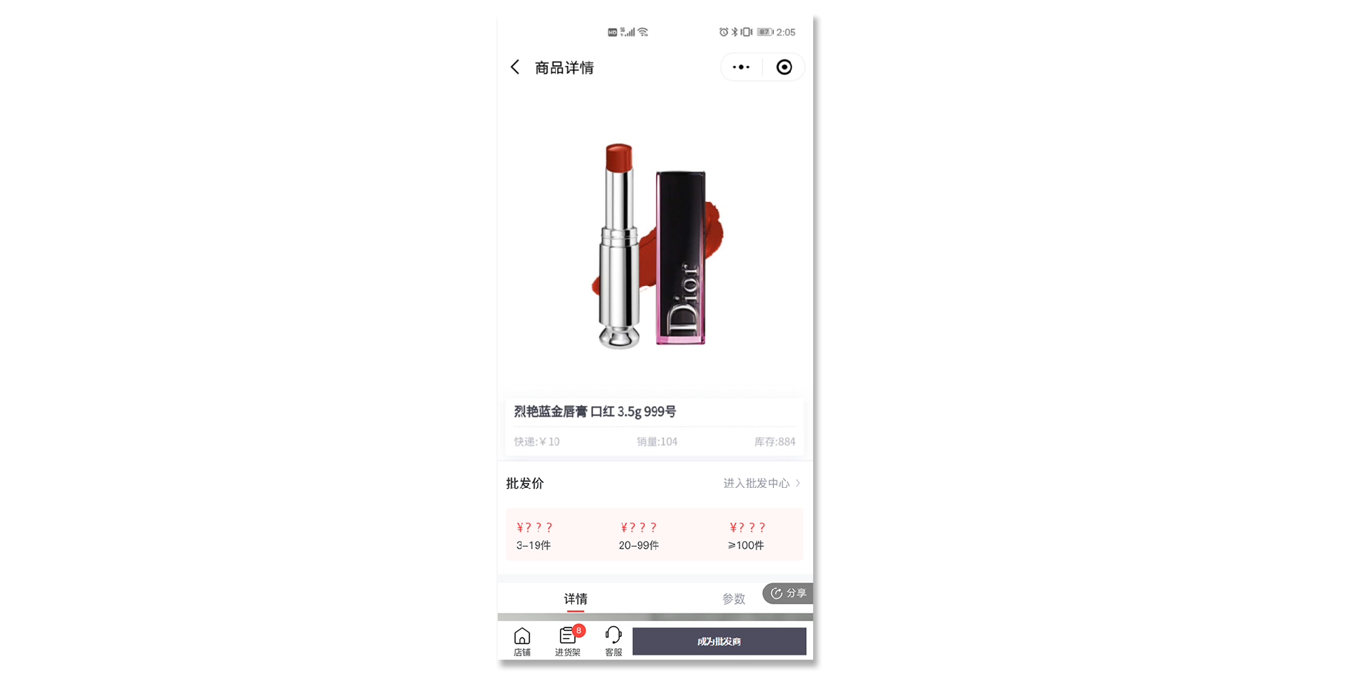 · 后台可设置是否对非批发商隐藏批发价格,并引导用户成为批发商。
