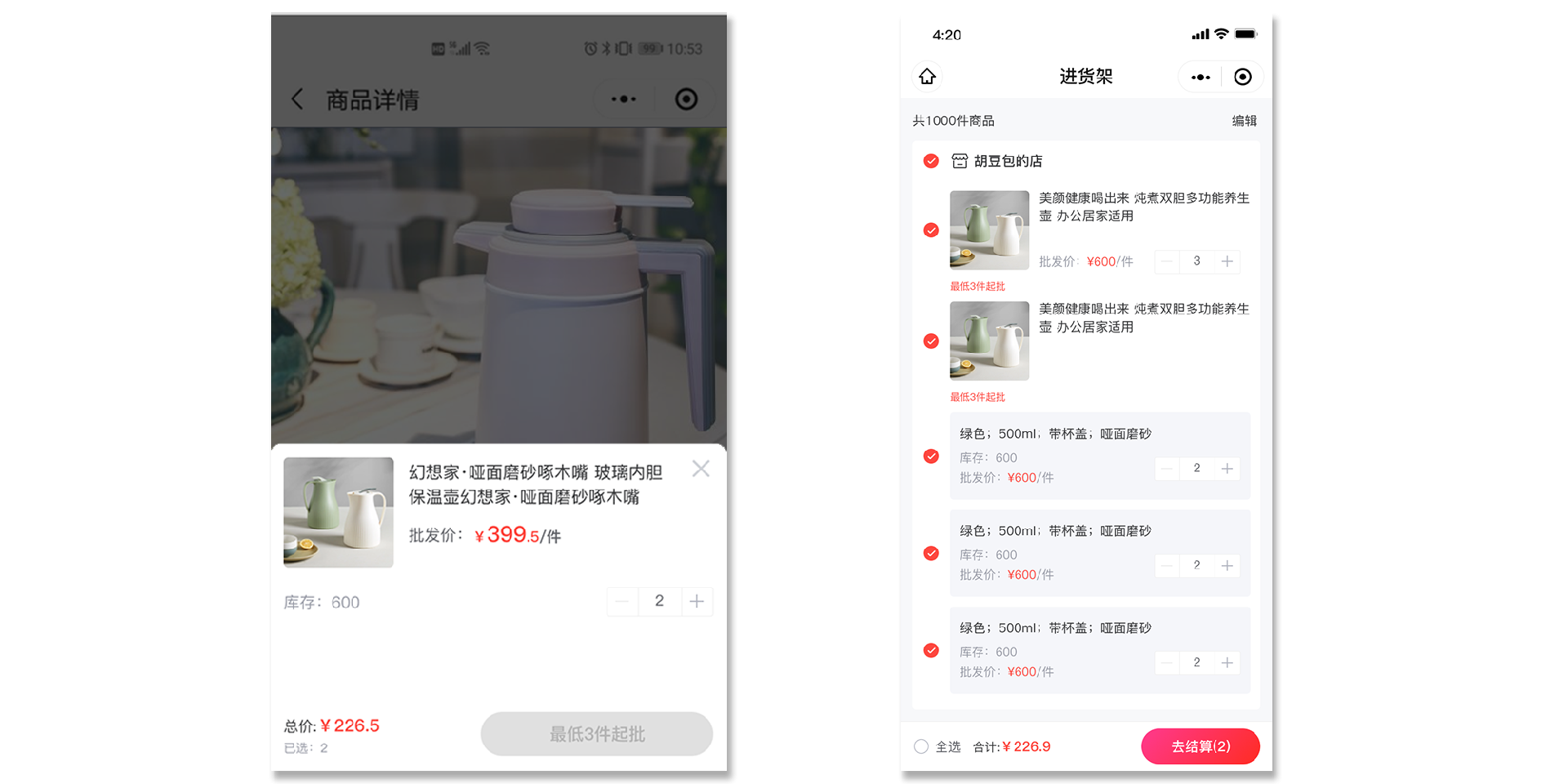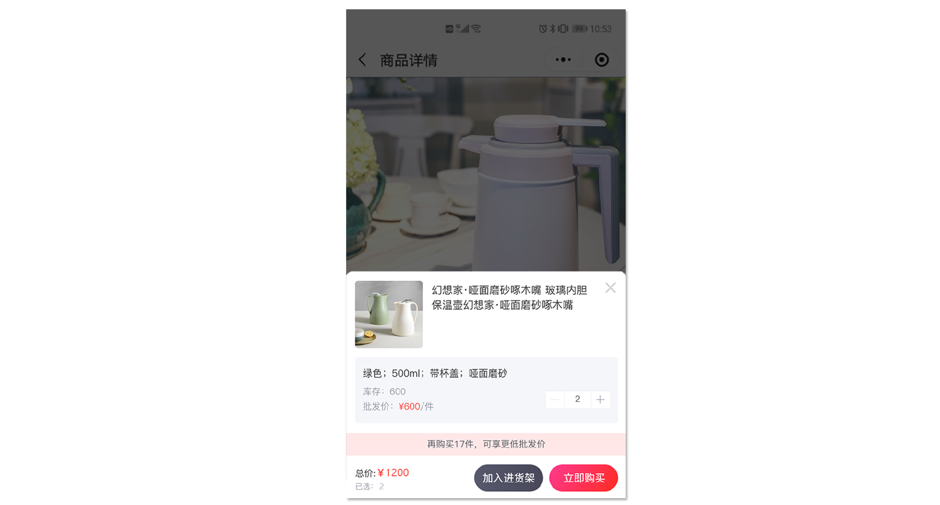 ·商品详情页和“进货架”都会显示阶梯优惠,引导用户多下单购买。