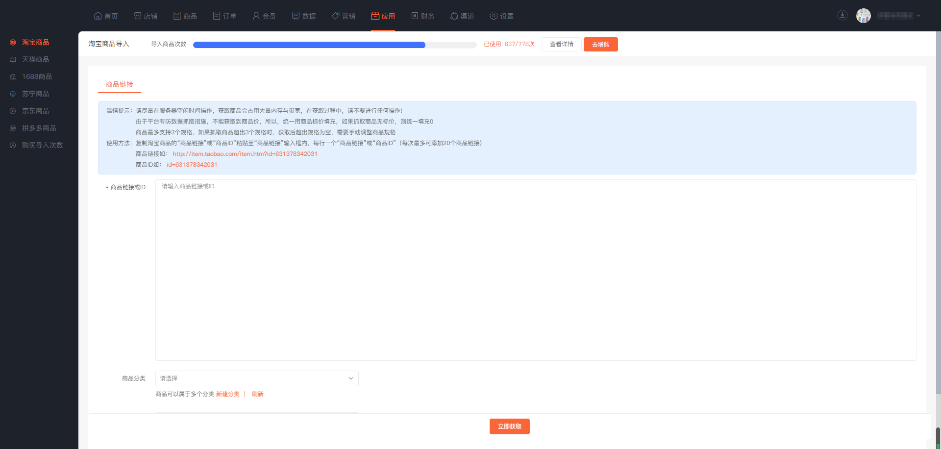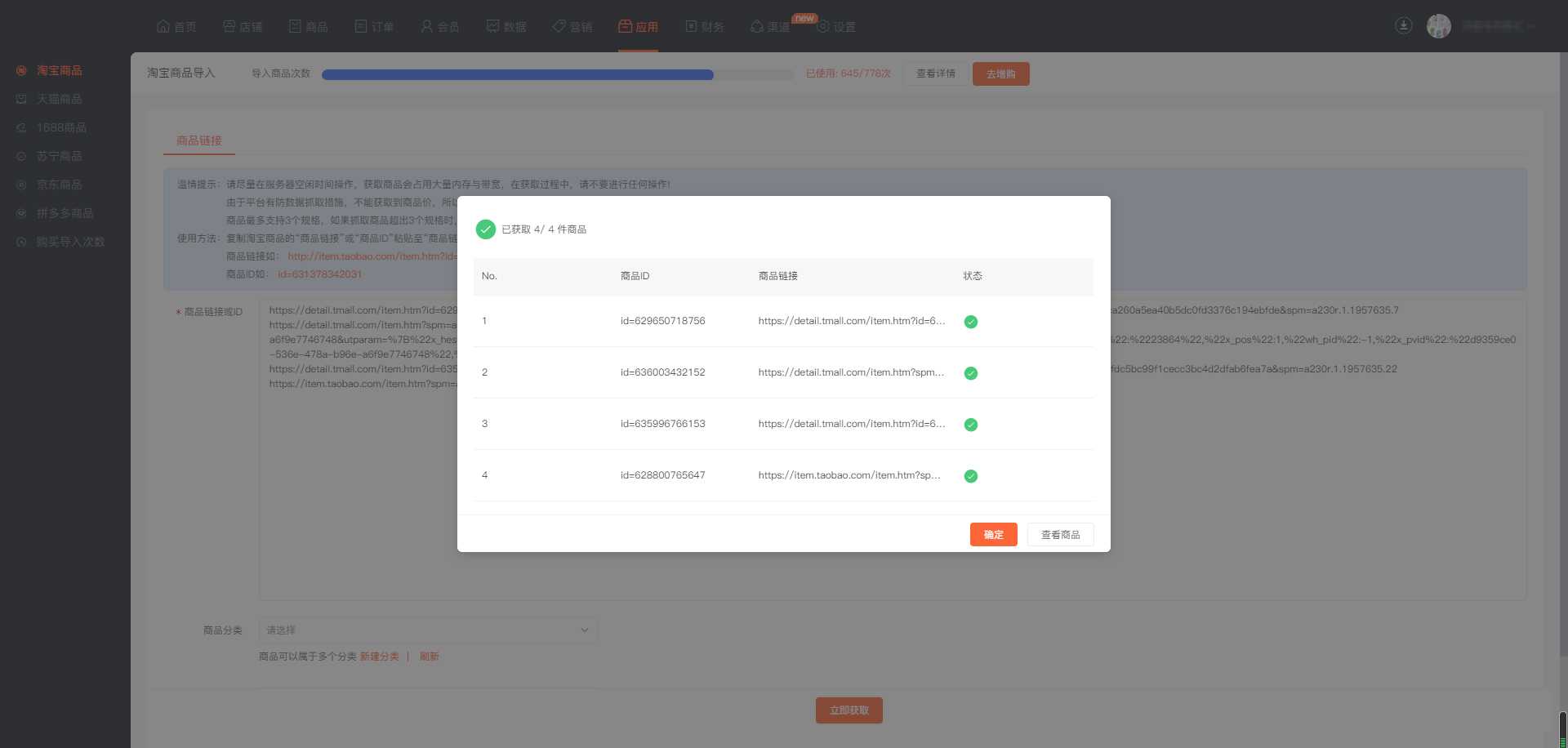 可批量导入商品信息,并展示商品获取进度,获取完成后展示已成功获取商品数量和总商品数量。