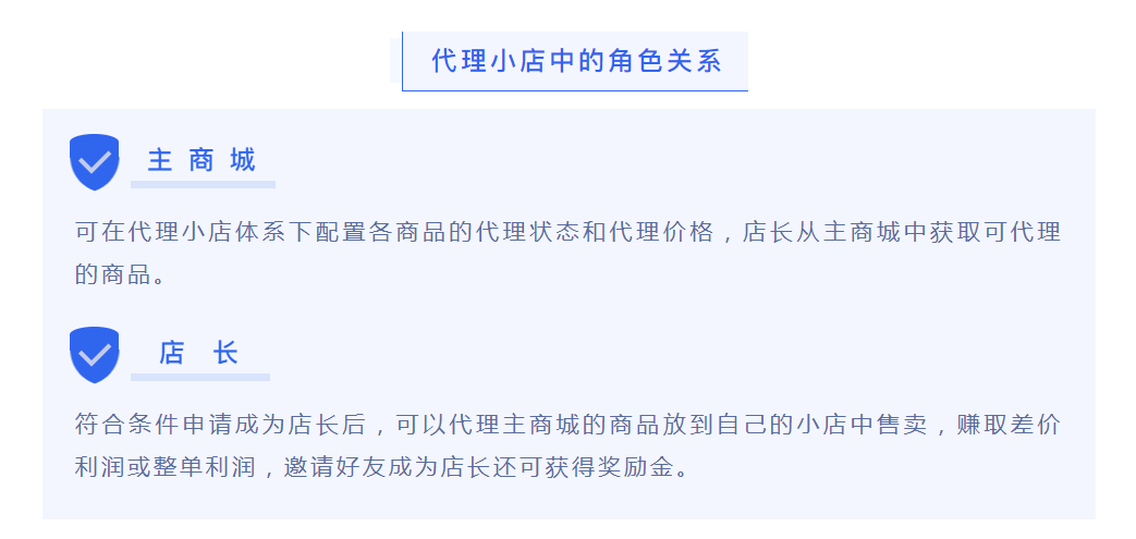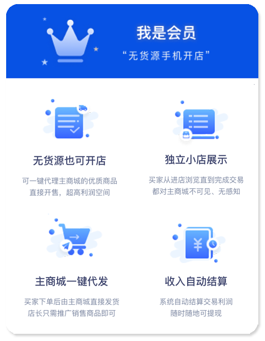 代理小店可以帮助商城会员生成自己的专属小店,会员通过小店中心进行申请,通过后可自主选择代理的商品和小店模板。