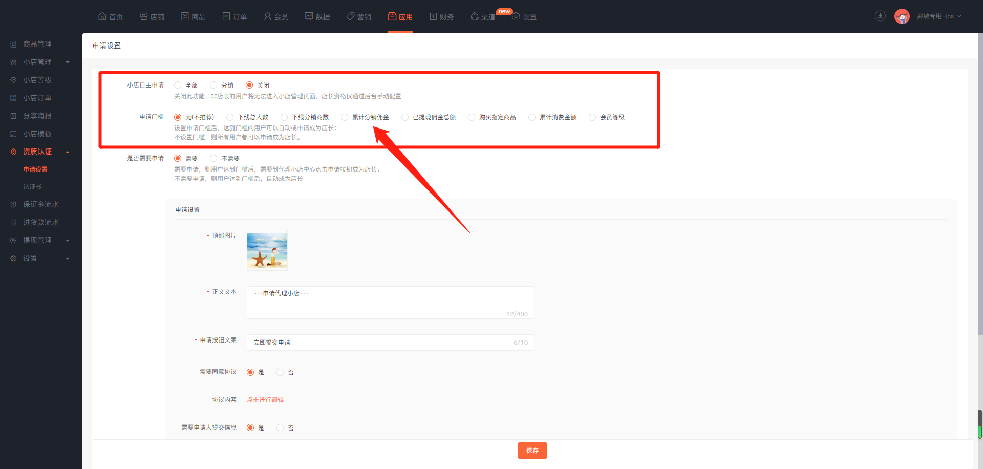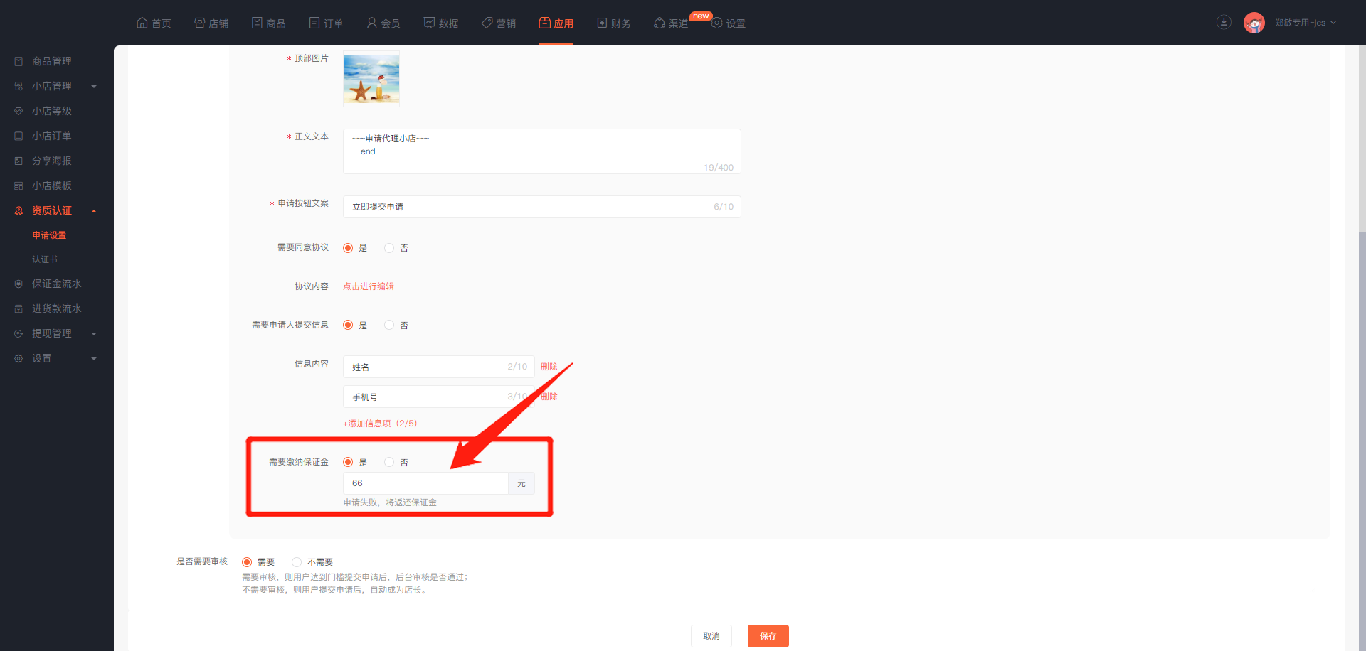 可设置缴纳保证金条件,模拟线下开店押金,鼓励代理商完成业绩,当关闭小店时,可以选择退还保证金。