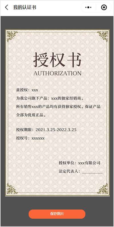 主商城后台可编辑资质认证书样式模板,成功开店的店长可在手机端获取保存该证书,证书编号可有序或随机生成且具有唯一性,大大增强了店长的归属感。