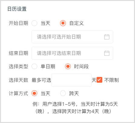 支持通过日历选择一段时间,目前天数的计算方式有2种:当天/跨天。当天模式即1号-5号等于5天,跨天模式即1号-5号等于4天。