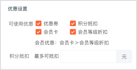用户在表单支付时可以选择使用优惠券、余额、积分抵扣、会员优惠。