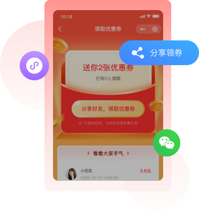 通过“分享领券”的模式帮助商家实现老客带新客,以极低的拉新成本获得更多店铺流量的承接、裂变和转化。