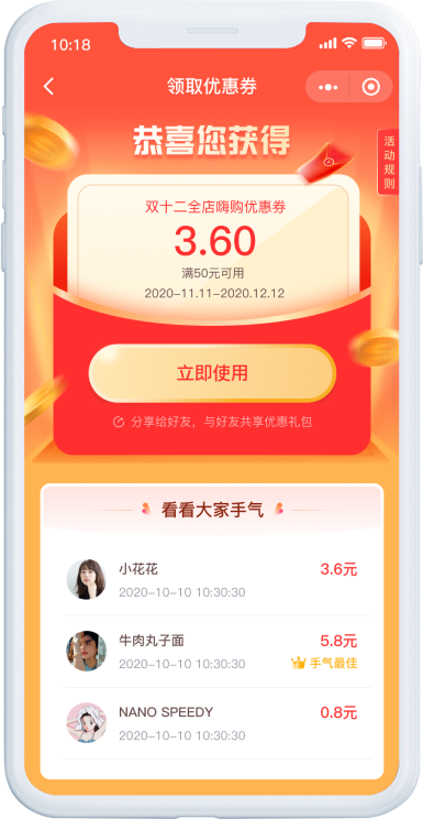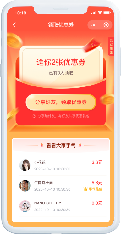 可设置用户分享优惠券后,第N个领取人获得最大金额N元的方式提高裂变效果,或以领取随机金额优惠券的方式提升活动趣味性。