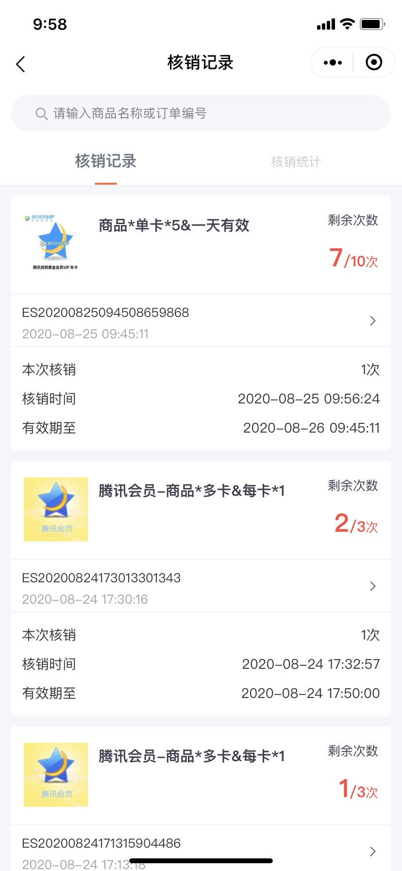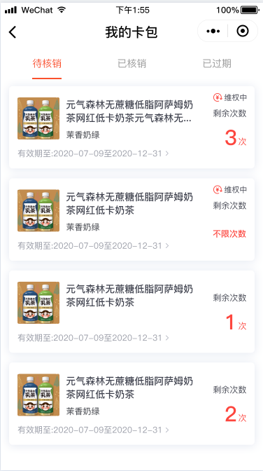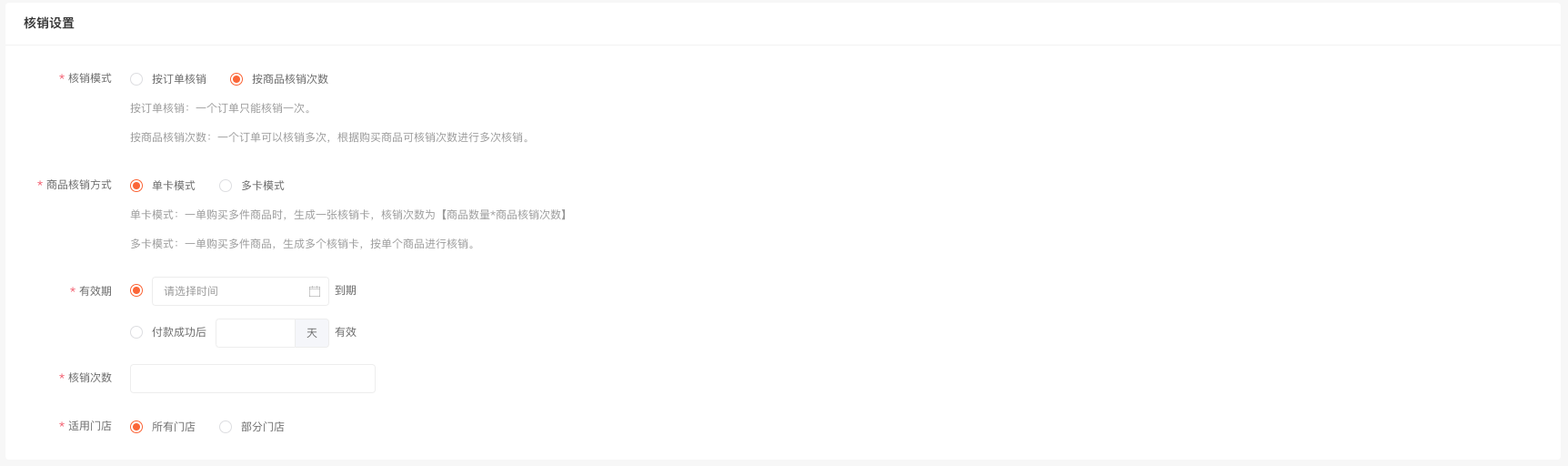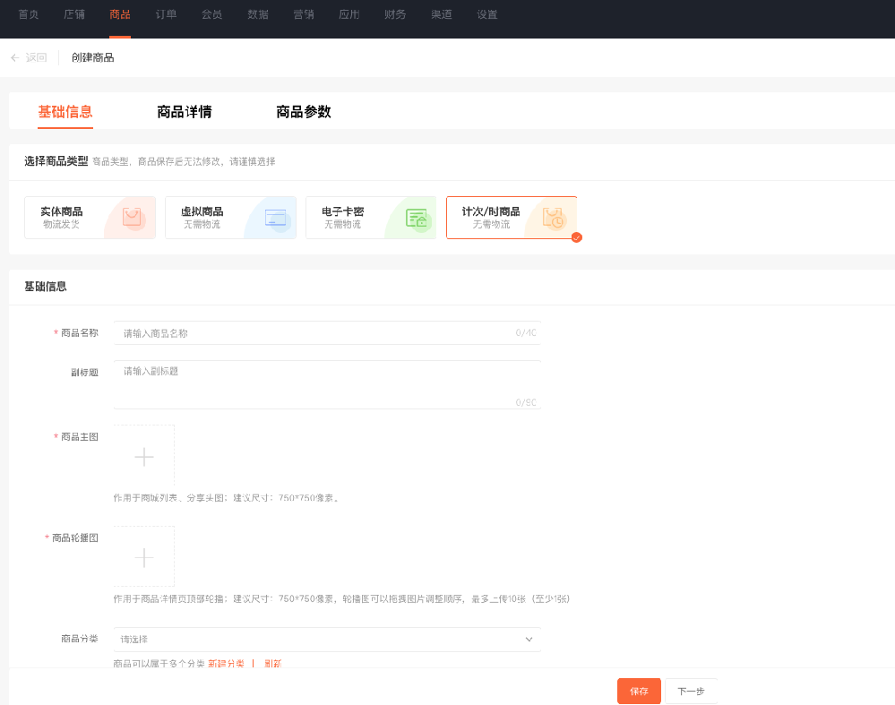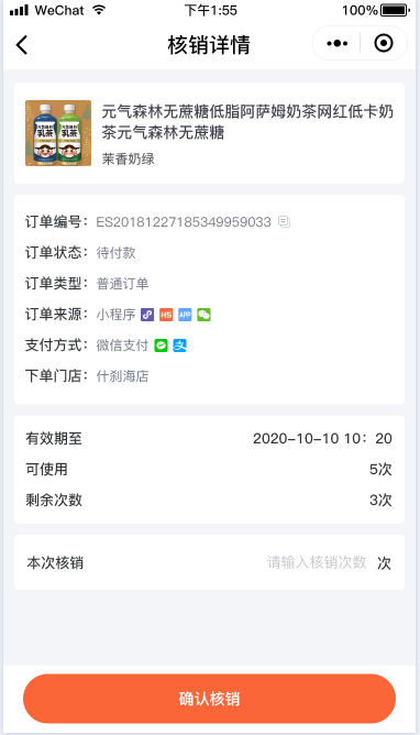 计次时商品应用可以创建计次/计时类型商品,如健身卡、景区门票等,会员购买商品后,生成核销卡,可分多次进行核销使用。 张三经营一家健身房,在公众号和小程序上售卖健身房门票,门票种类包含单次体验卡、周卡(一周可使用三次)和年卡。张三在ES店铺后台,创建了三个计次时商品。商品A:单次体验卡,核销次数为1次,有效期为1周。商品B:周卡,核销次数为3次,有效期为一周。商品C:年卡,核销次数无限次,有效期为一年。会员购买后凭借核销码进店核销使用,有效提高了门店的经营效率。 后台 - 应用 - 计次时商品 1. 添加计次时商品 (1) 商品类型选择计次/时商品,设置商品名称、图片等基础信息。 (2) 根据系统提示,设置商品核销方式。 按订单核销:会员购买商品后,一个订单生成一个核销卡,核销次数为1次。 按商品核销次数核销:会员购买商品后,可根据商品可核销次数分多次进行核销。 单卡模式:一单购买多件商品时,生成一张核销卡。 多卡模式:一单购买多件商品时,生成多张核销卡。 例:若一个订单购买了3件商品A,商品A可核销次数为2次, 单卡模式下,会员购买成功后,生成1张商品A的核销卡,该卡核销次数为3*2 = 6次。 多卡模式下:会员购买成功后,生成3张商品A的核销卡,每张核销卡可以核销2次。 核销有效期:商品只能在设置的有效期内进行核销使用。 核销次数:会员购买商品后, 可以分几次进行核销使用,多规格商品按规格进行设置。当核销次数设置为0时,在有效期内可以无限次核销。 适用/核销门店:当店铺未开启多门店应用时,可以选择商品核销适用的门店,手机端会展示适用门店列表,会员可以选择门店到店核销使用。 店铺开启多门店应用后,可以设置是否支持跨店核销,跨店核销开启后,需要设置可核销的门店,会员在A店铺购买商品后,可以去B门店核销使用。不支持跨店核销时,在A门店购买的商品,只能在A门店核销。 2.订单管理 (1)可根据商品类型,筛选计次时商品订单。 (2)订单详情显示该订单包含的商品核销卡,可以进行核销操作,并可查看核销记录。 (3)点击核销卡的核销按钮,输入核销次数、登录密码即可核销完成。 (4)核销记录包含:核销时间、核销次数、核销人和核销门店。 3.核销记录 核销记录支持按照商品、会员、核销门店、核销时间等进行筛选,并支持导出 4.店铺助手小程序 可通过店铺助手小程序进行计次时商品的核销。 点击核销按钮,扫描或输入核销码,输入核销次数,点击确认核销即可核销完成。 五:手机端页面展示 一:功能介绍
