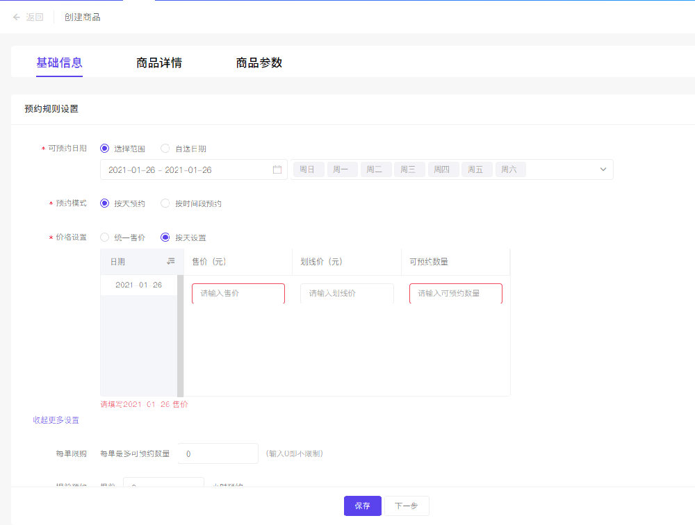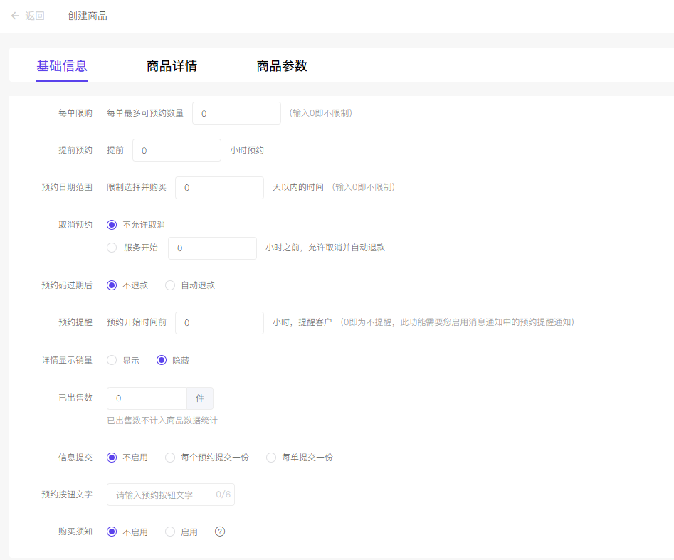 一、功能简介 预约到店插件可以创建预约类型的商品,按时间(天/时间段)、地点出售服务,用户购买后,获得核销码,到达对应时间后,线下核销,完成服务。 适用行业:美容美发、预约洗车、保健护理、活动门票、演出门票、景点门票等。 二、功能路径 购买【预约到店】应用完成后,到商品列表创建该类型商品即可。 三、创建商品 1. 设置日期时间 在预约规则设置中,必须配置该商品的可出售日期范围、预约模式、价格与预约数量,可以按天进行预约,也可以按每天的自定义时间段进行预约,每段时间的可预约数量和价格可以自定义。 预约到店的商品没有库存的概念,对应的是“最大可预约数量”,即此时间段最多可预约几人,商城出售预约商品后,此数值不会变动。 2. 高级设置 在预约规则设置模块这个,可以展开“更多设置”,根据商品的需求单独配置限购量、提前预约时间、是否允许取消预约、到店提醒等多项功能。 3. 预约地址 预约到店商品必须关联一个可用的地址,引导用户线下核销。 非多门店模式:此处可以选择设置中的门店列表,由用户自主选择预约目的地,也可以自定义设置一个地理位置,适用于景点门票销售。 多门店模式:门店列表将不可选,用户当前定位在哪个门店下,就预约的哪个门票,也可以自定义设置地理位置。 4. 预约日历与记录 预约到店应用本身提供预约日历和记录功能,商家可在日历中更形象直观的查看当前的预约情况。 四、购买与核销 1. 购买预约商品 用户浏览预约商品详情,点击预约后,只能选择此后的时间(未开始)进行预约,预约购买数量不得超过当前剩余最大可预约数,并在此页进行信息填写,确认后,进入支付界面。 2. 核销 用户购买完成后,每个商品对应1个预约码,即一个订单预约了n个人,则会在订单中出现n个核销码。 使用店铺助手小程序进行核销,需要每个码均进行核销 五、其他功能的兼容性说明 由于预约商品的逻辑特殊性,商城中某些功能暂不支持。 不支持的营销活动:砍价、定金膨胀、打包一口价、社群接龙、包邮。 不支持的应用:代客下单、社区团购。