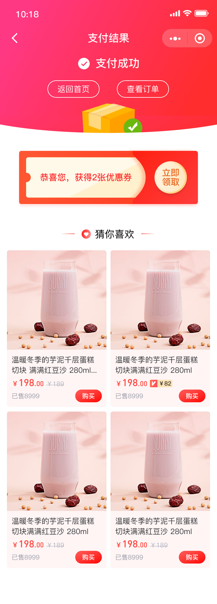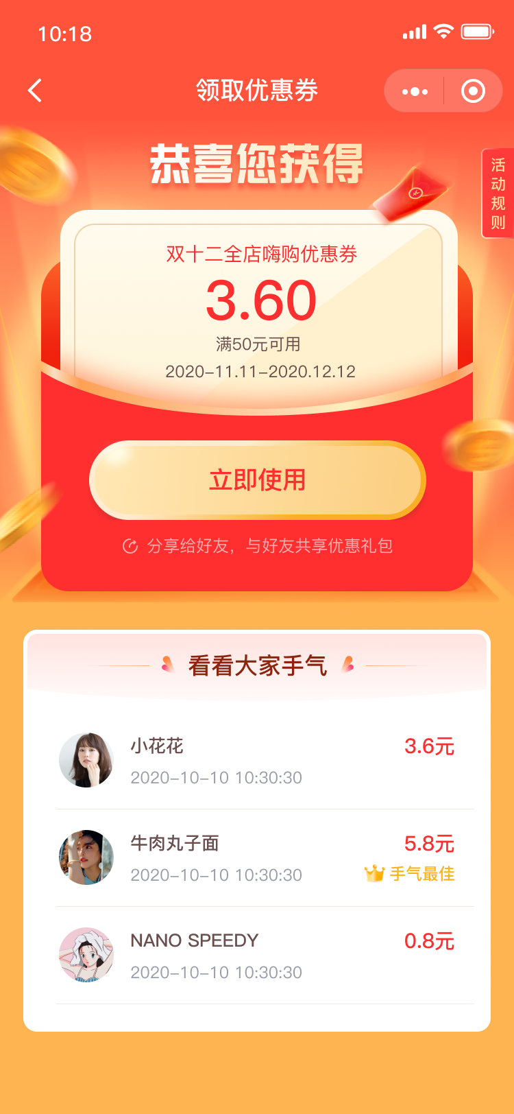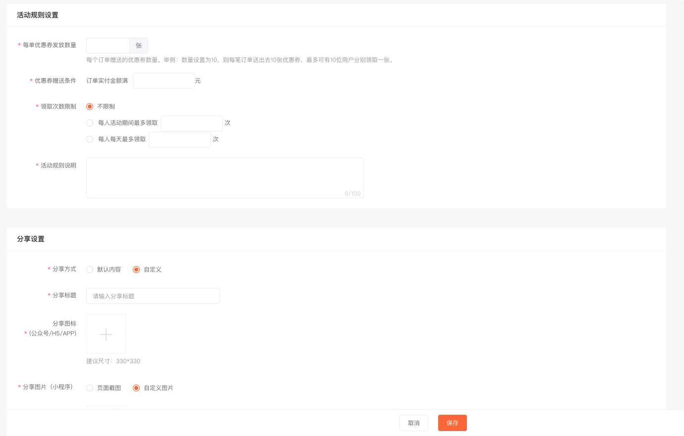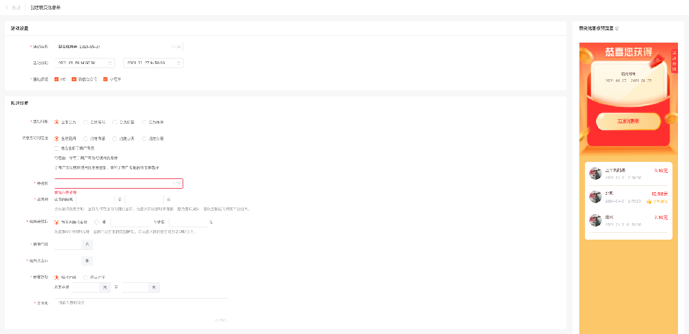 会员下单后,满足赠送条件时,可以获得优惠券礼包,分享给好友后,可以领取优惠券,优惠券金额随机,可指定第几个领多少元。引导用户分享进行裂变。在促进老客回购的同时,起到拉新作用。 后台 - 营销活动 - 裂变优惠券 (1)创建裂变优惠券,按需求选择优惠券的使用范围,券名称、券面额、消费门槛、库存、有效期和券说明等优惠券的基本内容。 (2)券面额为范围内随机金额,会员领取优惠券时,优惠券的面额为所涉范围内的随机金额,建议金额所设区间不要过大。 (3)优惠券领取方式分为两种: 范围内随机金额:会员领取优惠券时,金额为券面额所设区间内的随机金额。 第N个,领取X元:可以固定设置第几人领取固定金额,此处金额不受券面额范围限制。如券面额为:2-5元内随机金额,设置第3人领取10元,则第3个领取优惠券的会员会获得面额为10元的优惠券。 (1)每单优惠券发放数量:每个订单赠送的优惠券礼包中包含的优惠券数量。例:设置5时,每笔订单赠送5张优惠券,每个会员可领取一张,最多有5个会员分别领取一张。 (2)优惠券领取条件:订单实付金额满X元时赠送优惠券。未满足时,不赠送优惠券。 (3)领取次数限制: 每人活动期间最多可领次数:活动期间内,会员总共可领取的次数。 每人每天可领次数:按自然日计算,每人每天可领次数。 (4) 活动规则说明,在活动界面显示活动说明。 (5)分享设置可以选择默认分享内容,也可以自定义。 一:功能介绍