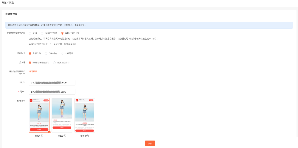 (3)公众号:因视频号只支持挂载微信公众号文章链接,所以使用此功能需要授权公众号,用来生成文章链接。可以选择使用商城已授权的公众号,也可选择使用新公众号来生成商品分享链接。