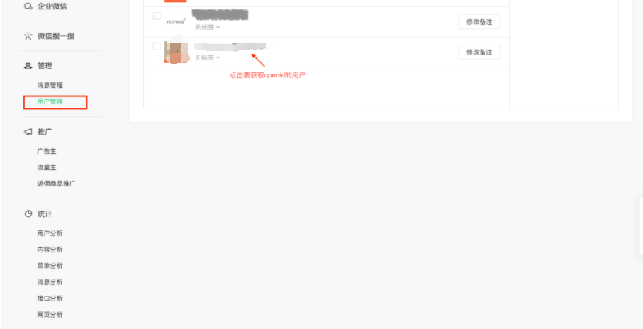 1. 登录微信公众号平台,点击用户管理,点击要获取的用户的昵称,进入与用户的聊天界面。