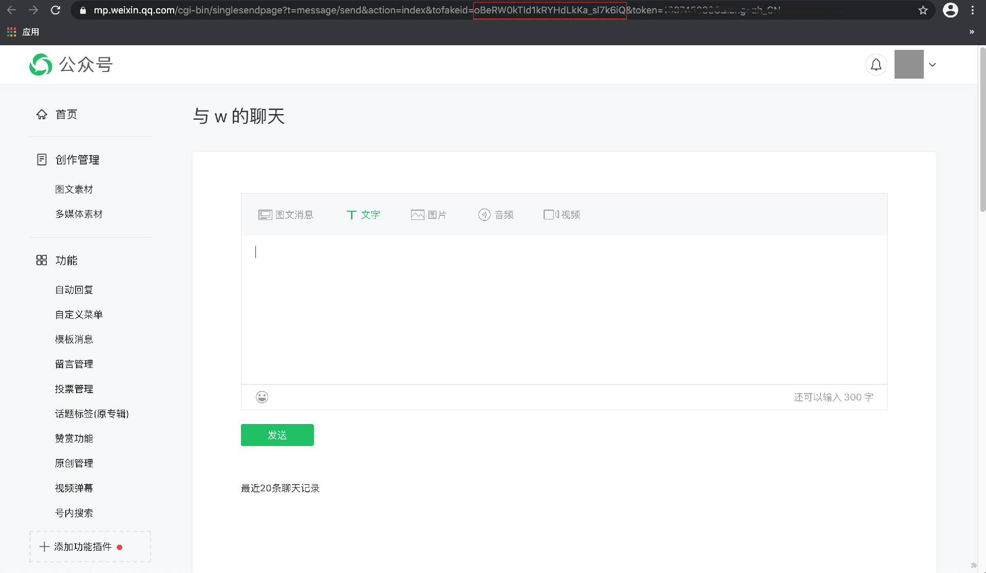 2.进入与粉丝的聊天界面,查看顶部网址,标红的地方为该粉丝的openid。