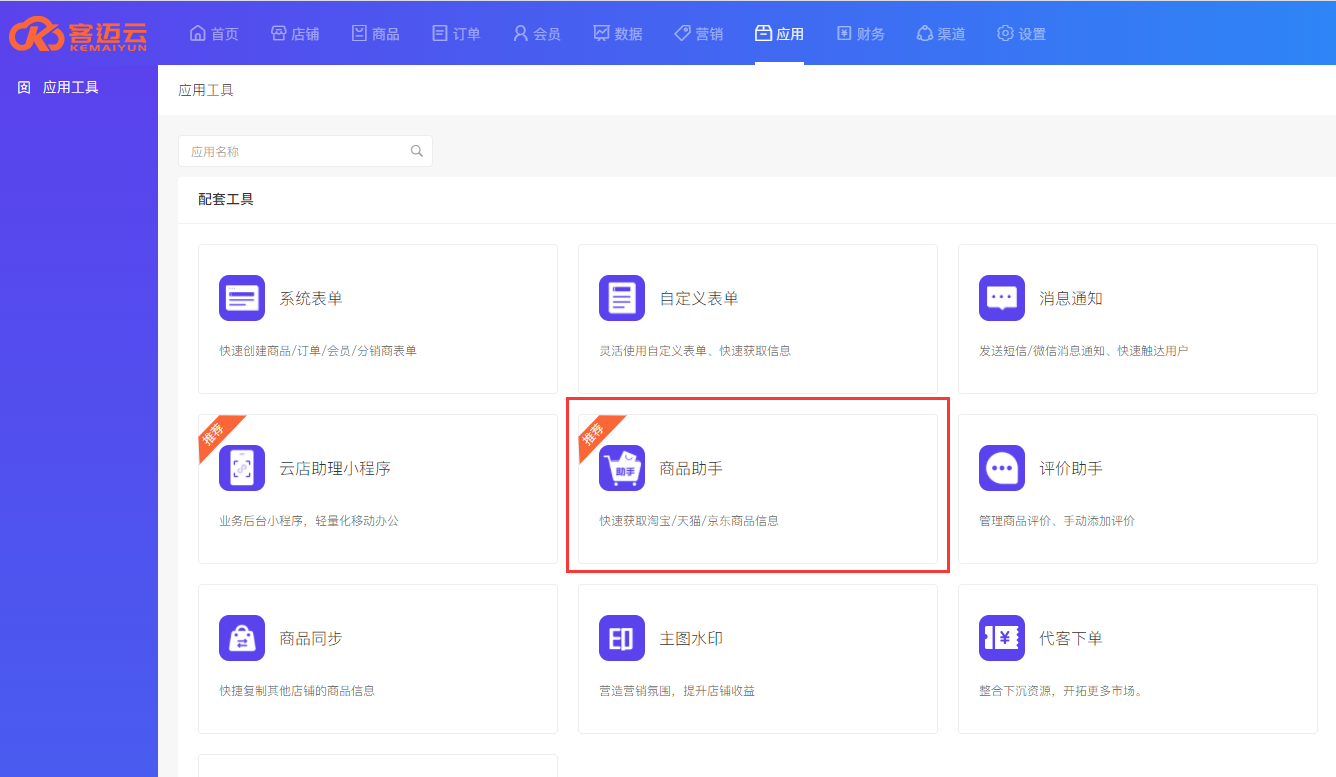 第一步:登录后台—点击应用找到商品助手