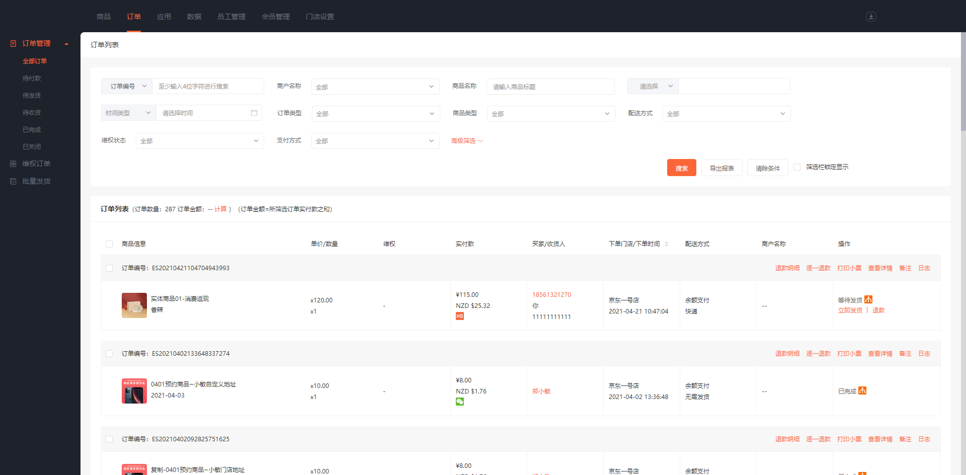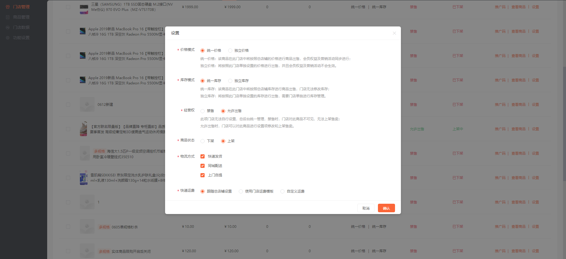 一、功能简介 多门店系统是一个面向线下连锁零售企业的全渠道信息化管理工具,提供完整的分门店线上经营方案。 适用业态:直营连锁、品牌加盟、同城O2O、大区分仓 适用行业:水果蔬菜、生鲜、蛋糕烘焙、便利店、零食、餐饮外卖、鲜花、日用百货等。 二、基础概念释义 总店铺:即当前开启“多门店”店铺后台;所有商品由总店铺创建,然后分配给各个门店售卖权限,开启“多门店”后,总店铺不再单独对外售卖商品,用户进入商城,必须定位到某门店中,才能购买商品。 门店:“多门店”应用中创建的所有门店统称。 总店:可以将某一个门店设置为“总店”,根据应用的设置,当用户无法定位时,将会进入总店。 三、使用流程 1、创建门店 2、设置商品 3、在装修中,添加“网点定位”组件 4、在多门店【设置】中,开启功能 四、商品设置说明 1、价格模式 ▲ 决定商品在该门店下的价格策略; ▲ 统一价格——商品将按照“总店铺”的价格进行出售,会员权益、分销、各种营销活动同步进行; ▲ 独立价格——商品将按照该“门店”自行设置的价格进行出售,该价格门店管理员可以修改,同时会员权益、分销、营销活动将不会生效。 2、库存模式 ▲ 决定商品在该门店下的库存管理模式; ▲ 统一库存——商品将按照“总店铺”的库存进行出售,总店铺的库存增加即门店的库存增加,当有多个门店使用统一库存时,则库存数量为一致,同步加减; ▲ 独立库存——商品将按照“门店”自行设置的库存进行出售,该数值需要管理员主动修改,每个商品的默认独立库存值为0。 3、经营权 “总店铺”可以通过此项,管理各个门店对商品的销售权,禁售时,则该门店对此商品不可见。 4、商品状态:由门店自行管理商品的上下架 5、物流方式/快递运费:由门店自行管理 6、其他说明 ▲ 每新增一个门店时,“总店铺”所有的商品对此门店默认均为禁售,商品状态为“下架”,需要管理员针对每个门店进行设置; ▲ 每新增一个商品时,该商品对所有门店默认均为禁售,商品状态为“下架”; ▲ 门店无法新增商品及修改商品详情信息。 五、订单管理 ▲ 开启多门店后,用户进入商品必须定位到门店才能进行下单,下单时携带门店信息,“总店铺”依然可以操作所有订单,各个门店的后台仅能管理在本门店的订单; ▲ 上门自提的订单,下单时不再支持自行选择门店,默认选中当前定位的门店;自提订单不允许跨店核销,在哪个门店下的单,只能由这个门店进行核销。 六、员工管理 ▲ “总店铺”可以在门店设置页面,分配一个员工,设为该门店的“店长”,店长将拥有该门店的所有管理权限,可以登录门店子后台,进行订单操作、数据查看等; ▲ “店长”可以在门店子后台添加该门店下的员工,操作和总店铺相同; ▲ 一个账号可以成为多家门店的“店长”或“店长员工”; ▲ 拥有“总店铺”下“多门店应用”管理权限的账号,可以进入操作所有的门店,无需再设为“店长”。 七、店铺装修 ▲ 当前版本的多门店系统,不支持分门店装修,用户进入商城展示的界面均为“总店铺”的装修策略; ▲ 根据用户定位的门店不同,商品所展示的价格、库存可能有所不同(独立价格、独立库存的情况下)。 八、云店助理小程序及核销说明 ▲ 云店助理小程序也同步多门店系统,在开启多门店的状态下,员工登录时,需要选择进入“总店铺”或“门店”后台; ▲ 自提订单的核销,必须由下单门店进行核销,不可跨店核销,其他门店的员工扫码将不会识别。